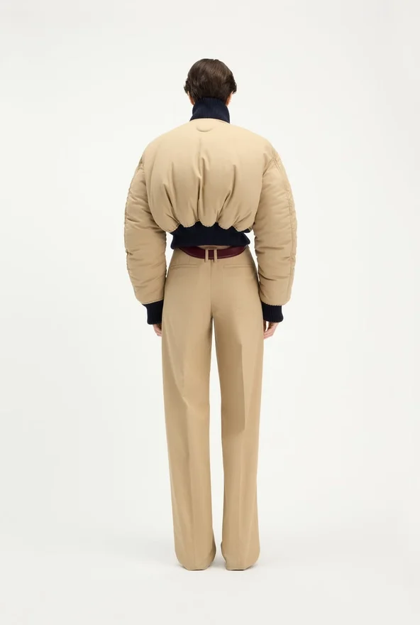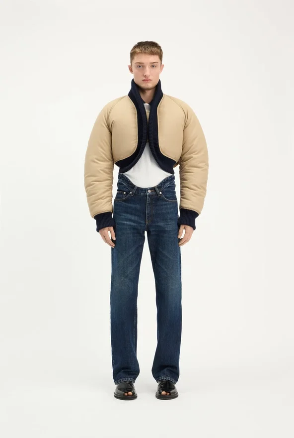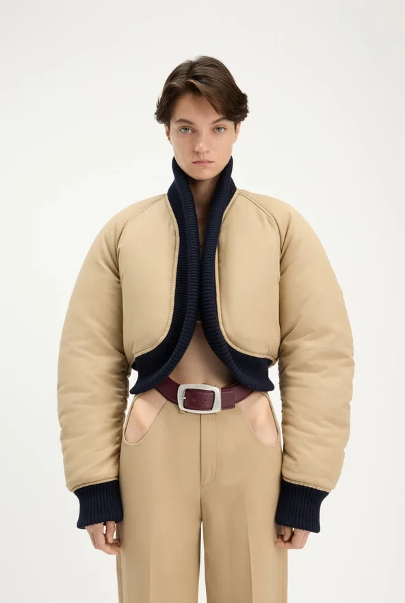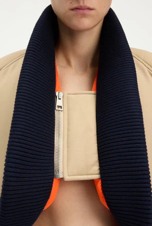 Beige Cotton Bomber Jacket with Navy-Blue Ribbed Edging.