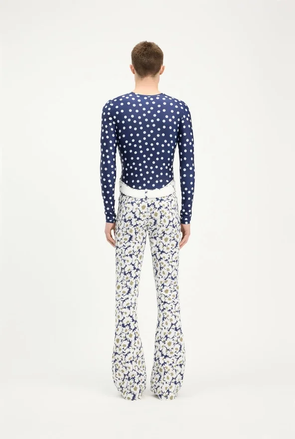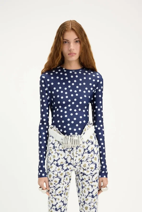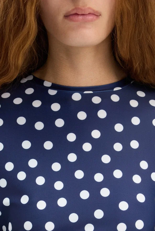 Long-Sleeved Navy-Blue and White Lycra Jersey Top with Polka-Dot Print.