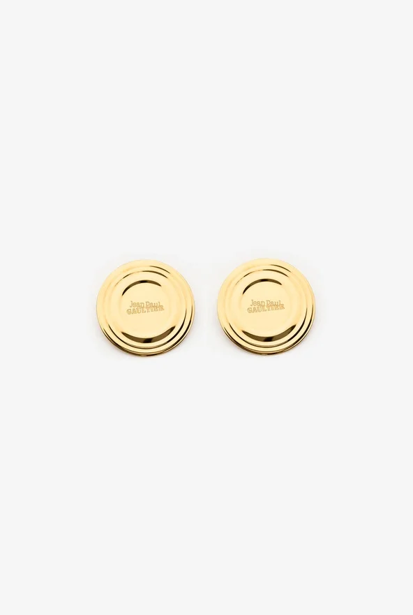 Gold-Toned Brass Earrings in the Shape of Engraved Jean Paul Gaultier Can Lids.