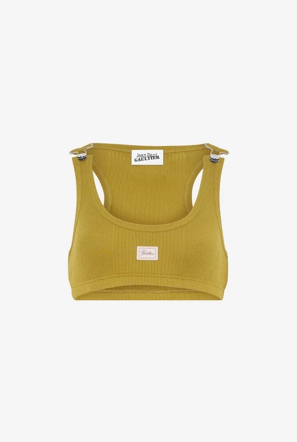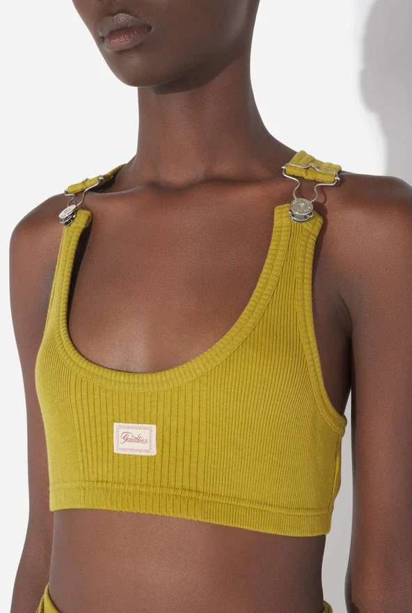 Beige Ribbed Cotton Bra with Overalls-Inspired Buckles with Jean Paul Gaultier Engraving and Gaultier Patch in Front.