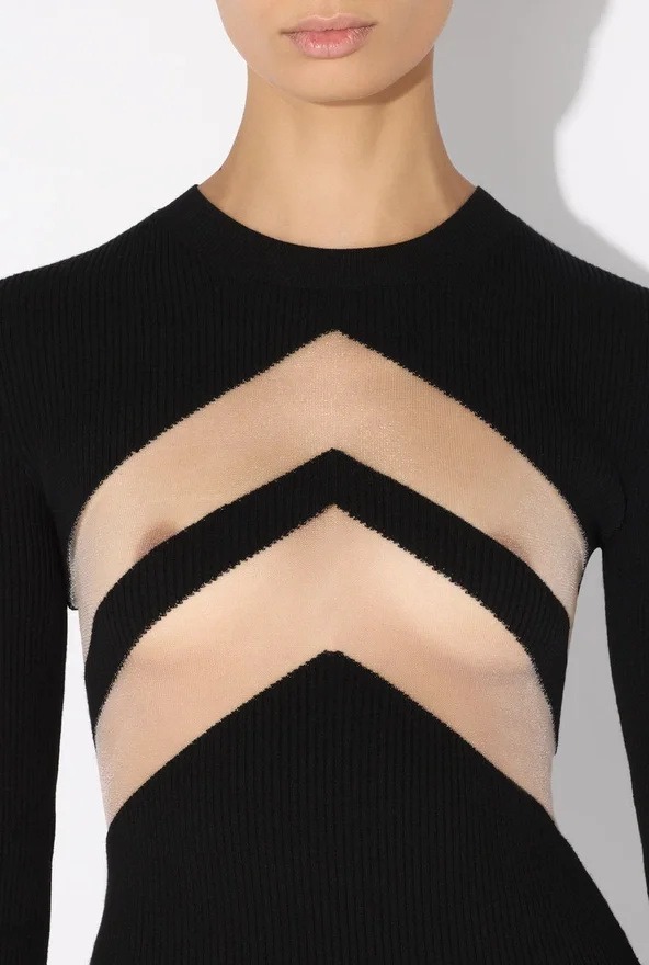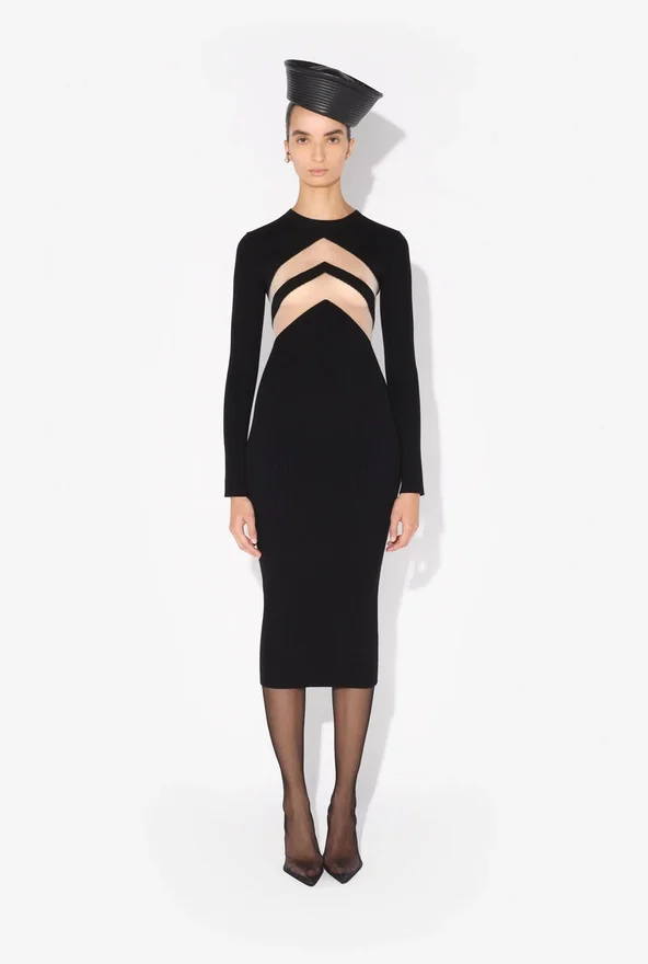 Long Black Knit Dress with Transparent Chevron Pattern.