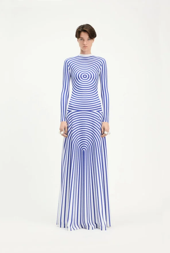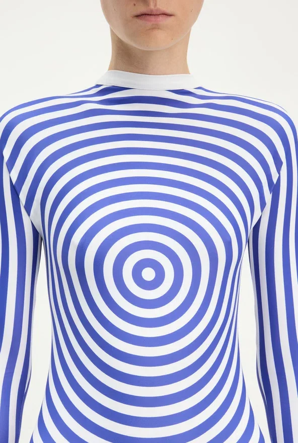 Long Blue-And-White Lycra Jersey Dress with “Target” Print.