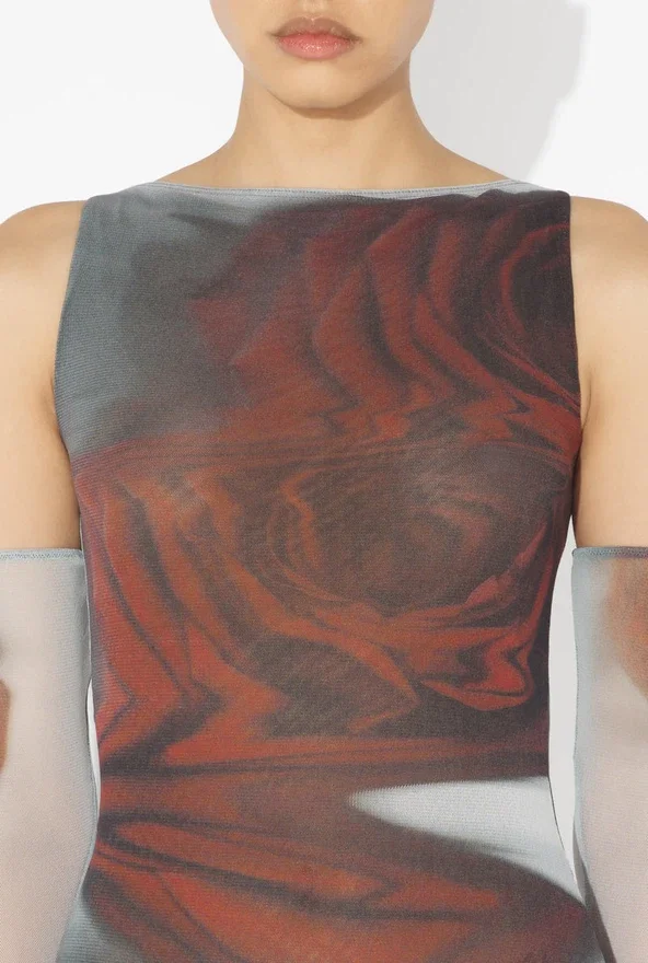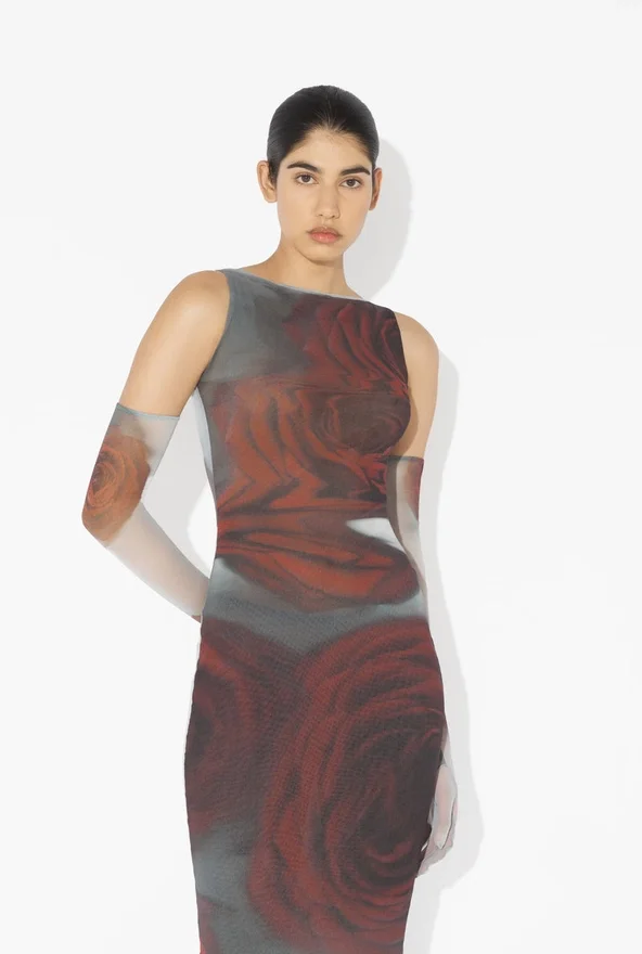Long Red Tulle Dress with “Blurry Roses” Print.