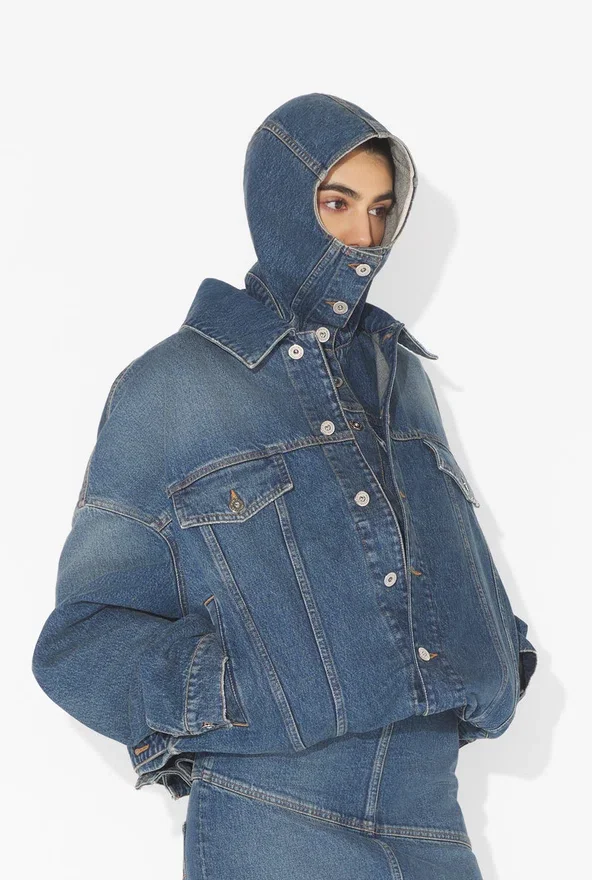 Blue Denim Jacket with Layering Detail, Built-In Hood and Jean Paul Gaultier Label in Back.