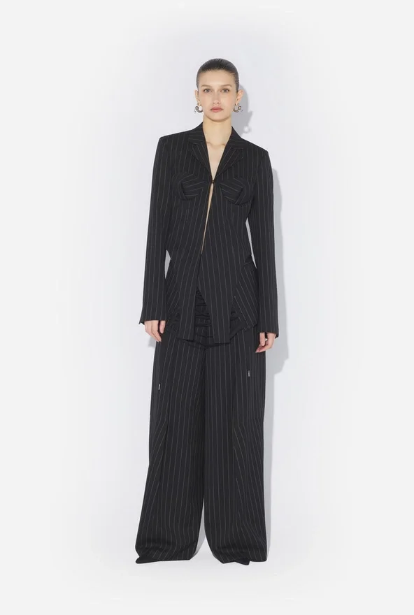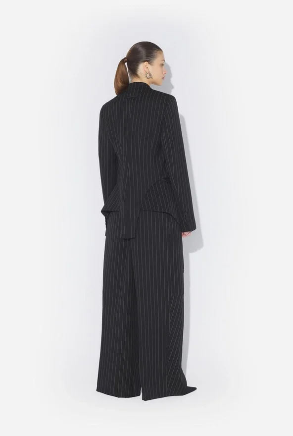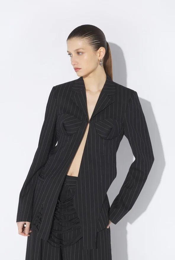 Asymmetrical Jacket in Black Virgin Wool with Tennis Stripes, Corset Detail and Topstitched Panels on Chest.