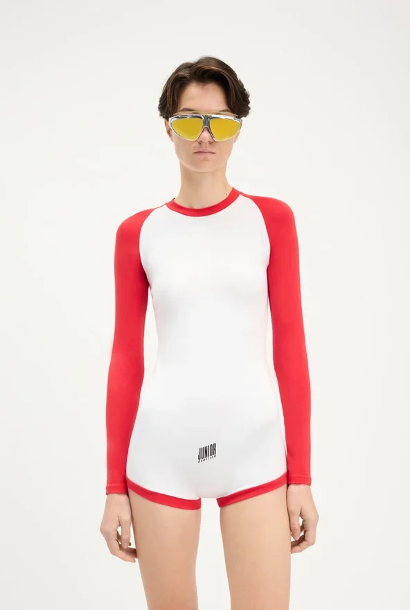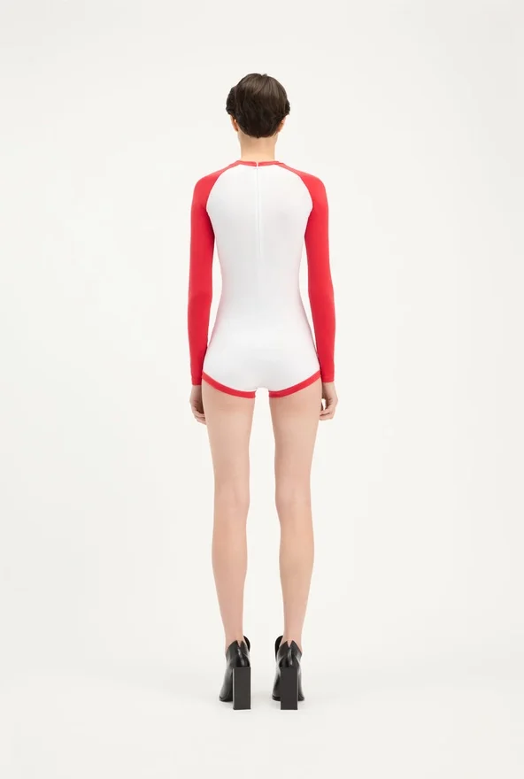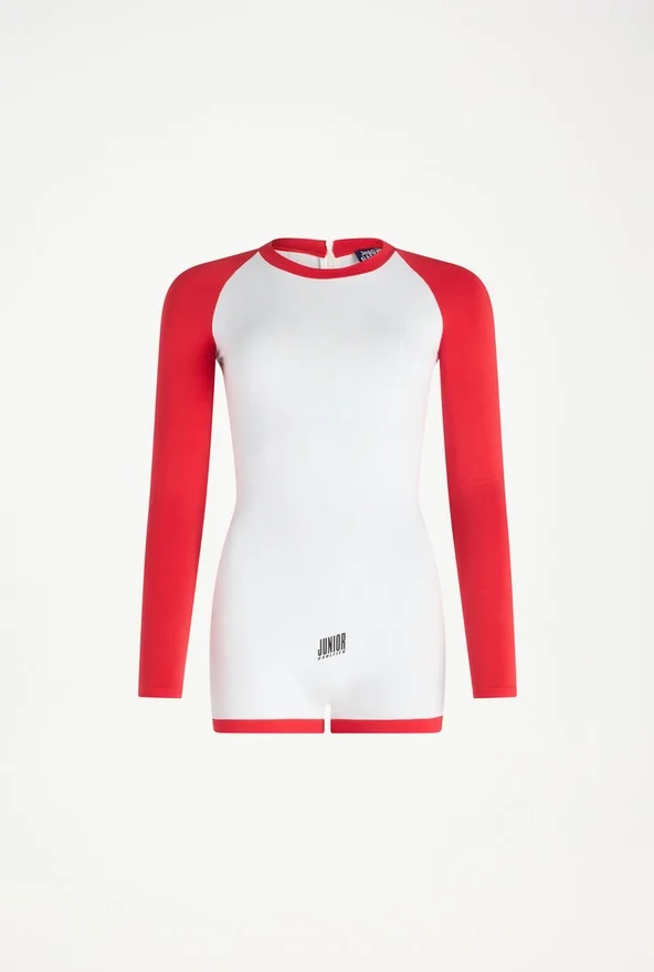 Long-Sleeved Bicolor Jersey Playsuit with “Junior Gaultier” Printed Logo Detail.