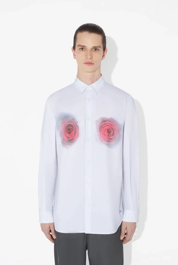 White Cotton Shirt with Red “Blurry Roses” Print.