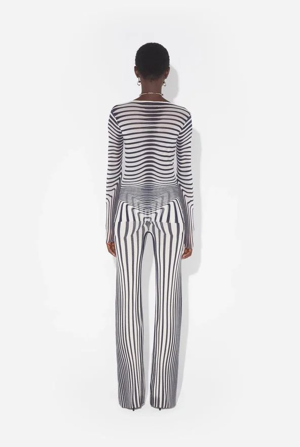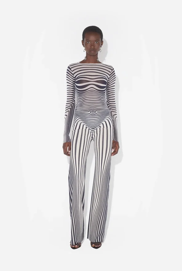 Long Sleeve Mesh Top in Ecru with Night Blue Printed Body Stripes.