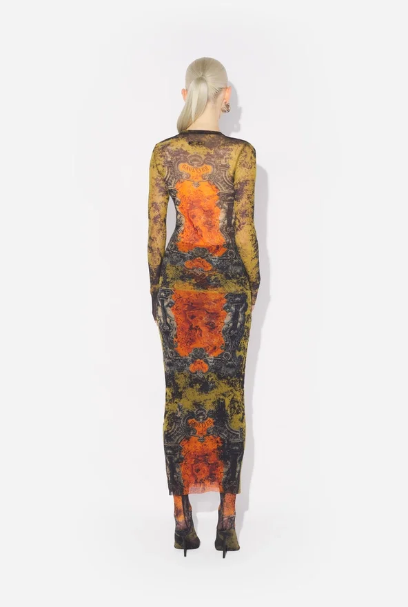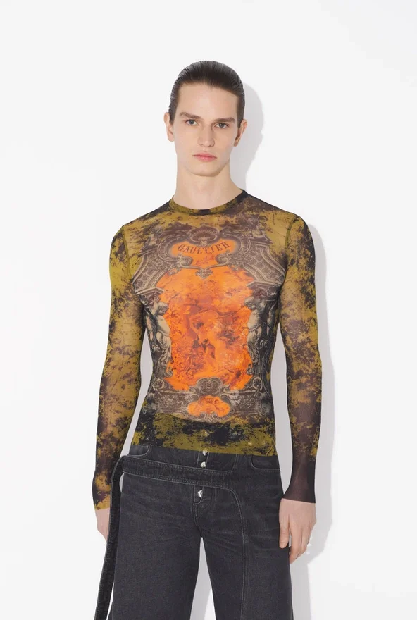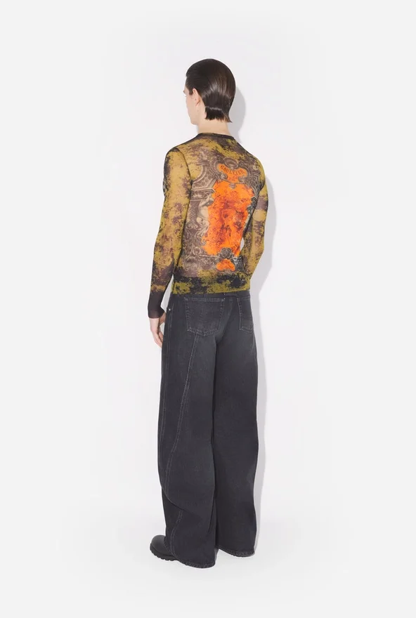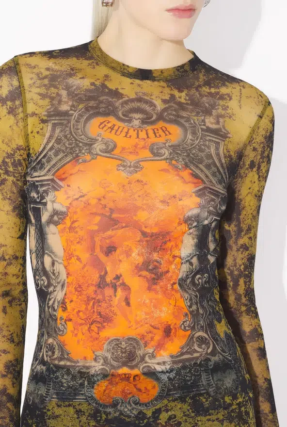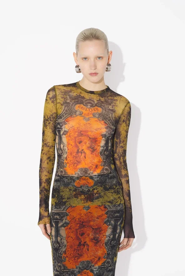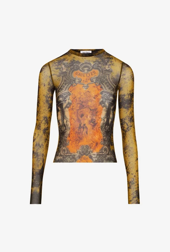 Long-Sleeved Khaki Tulle Top with “Madaillon” Print.